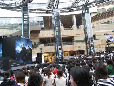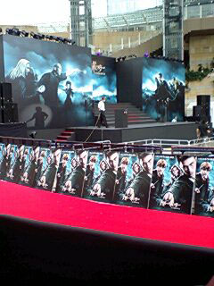 レッドカーペットイベントも参加するのですが、チケットには17:30開場とあるだけなのでそれまで何もする事無いだろうと思ってましたが、一応場所を下見しておこうと思ってなんとなくアリーナに向かいました。そしたらなんか並んでるじゃないですか!? (゜゜;)エエッ、17:30開場のためにもう行列してるの?! 今からずっと8時間も並び続けて入場を待つんじゃお昼も食べれないしトイレも行けないじゃん!とびっくりしましたが、でなくて整理券を配布してるとの事でした。 整理券て・・・、十分オドロキですよ。整理券順に入れるなら早い者勝ちなのにチケットのどこにも書いてないし何の連絡もしないなんて! 早くから会場に来てても知らないでぶらぶらしてた人は損ぢゃないかぁ~! 私ほどハマってないものの、ハリポタ好きなのでイベントが当たると一緒に来たがる母と参加する予定でしたが、母は最初夕方来る予定だったので既に並んでてチケットなくて入れないとマズイと思いチケット渡してあったので、自分の分しか引き換えられない。場所が離れちゃうじゃん! そして整理券貰った人は16:00に集合して下さいだって。開場時間まで告知済みの情報と違うわけ?ここでまず、頼むよワーナー!とムカツキましたが、この日ワーナーにムカツク事はまだまだ続くのでした。。。 でも気を取り直して列に並んだら、ここで最初のコスプレの方を目撃♪ 湿気の多い梅雨の時期の真夏日だったこの日は本当に蒸し暑くて、お気に入りのお手製グリフィンドールマフラーをして来たかったけど、死ぬかもしれんと思って諦めたのに、ハリーとハーマイオニーになったお二人は、シャツ、ネクタイ、セーター、ローブにカツラという完全装備! なのに汗もかかずに女優さんみたい!すごく雰囲気出ていて可愛いくて、並んでる段階で既に取材を受けていました。 夏の映画公開はポッタリアンにとって過酷ですね・・・。夏じゃなきゃもっとコスプレの人いっぱいいると思うのに。夏のがヒットはするらしいですが。 恥ずかしくて完璧なコスプレはした事ないですけど、暑くてちょっとした小物のなんちゃってコスプレも諦めたので、私はタイムターナーを下げて、バッグにはふわふわのヘドウィグマスコットを付けて、携帯にはファイアボルトを付けて、ハリポタグッズではないけどかぼちゃのピアスをして行きました♪